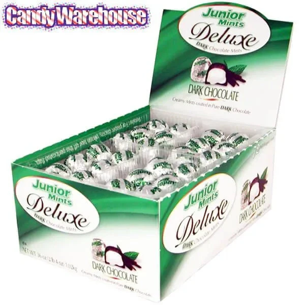 Display box contains 72 foil-wrapped Junior Mints Deluxe Dark Chocolate Mints.
