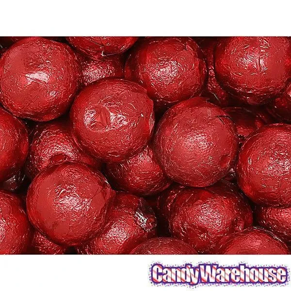 Bag contains 5 pounds of Red Foiled Caramel Filled Chocolate Candy Balls.